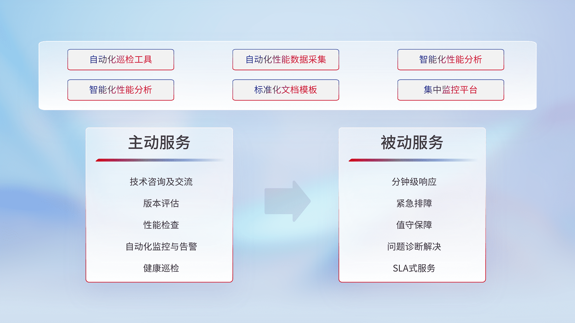 智能化工具和标准化文档,,保障服务质量,,提供主动服务(包含技术咨询、、、、版本评估、、、、性能检查、、、自动化监控与告警、、健康巡检)和被动服务包含(分钟级响应、、、、紧急排障、、、值守保障、、、、问题诊断解决、、、SLA服务)。。。